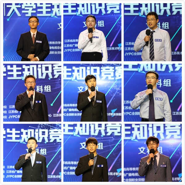 江苏省第十一届大学生知识竞赛(文科组)面向省内普通高等院校的文科大学生,一如既往地得到全省各高校的积极相应,100所高校自发组织学生参加,覆盖面达60%;参赛学生5万余人。根据参赛学生的笔试成绩,知识竞赛组委会经专家评审共评选出一等奖15名、二等奖104名、三等奖898名、优秀奖4208名。特等、一、二等奖除给予以不同额度的现金奖励外,还可获得JYPC颁发的自然科学知识水平证书。根据各校在知识竞赛的综合表现,知识竞赛组委会评选出优秀学校奖、优秀组织奖各20名,优秀组织管理者50名?;竦糜判阕橹芾碚呓钡睦鲜Γ槲岚浞⒌闹な橥?,还由JYPC颁发高级教育咨询师证书。知识竞赛的笔试早于2019年4月进行,根据参赛学生的笔试成绩,共选拔出本科前7名同学和专科前2名同学,共9名选手进入决赛。他们分别是来自南京大学顾奕皓、南京大学刘元英、南京农业大学王泓宇、南京林业大学邵天琪、南京审计大学宋浩天、南京中医药大学李威、盐城师范学院王玉兰、南京科技职业学院经森、连云港师范高等专科学校蒋心毅??晌酵蚶锾粢?!