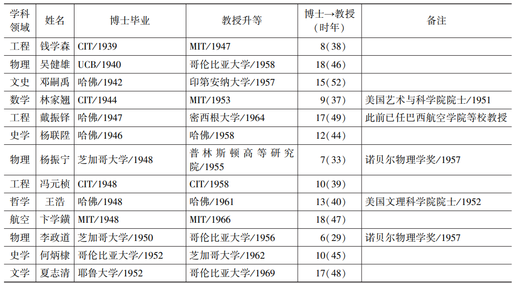 以上的初步统计表明,在20世纪40年代的欧美,名校博士毕业后一般还需博士后研究经历才能获得教职,并从讲师或助理教授起步;从博士毕业升等至教授,一般接近20年,10年以内的并不多见(文法科尤然)。前述学人都是当时各方公认的杰出华人学者,在欧美名校亦属佼佼者,其升等速度远快于一般欧美知名学者。然其中速度最快的李政道,也花了6年。——而彭桓武则在获得首个博士学位(1940)并从事博士后研究5年后才成为助理教授。谢毓章1944年(29岁)起任广西大学教授,1950年获范德堡大学博士学位后,直到1957年仍未能获得教授职位(回国后迳任清华教授)。被胡适极为看好的北大杰出教授马仕俊,1946年起在欧美多国从事研究,直到1953年才获得悉尼大学教职。由此可见,中西大学教授标准之间,仍有相当差距。