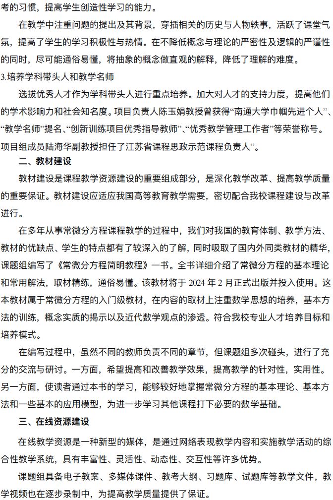 南通大学陈玉娟、陈莉 主持完成了2022年江苏省高校“高质量公共课教学改革研究”专项课题“常微分方程课程优质教学资源建设研究”(课题编号:2022JDKT092),课题组主要成员:黎野平、陆?;⒁笕?。