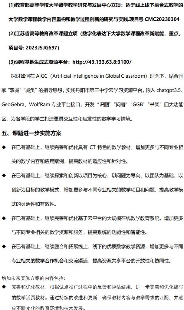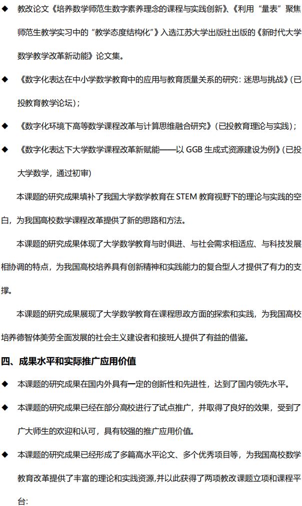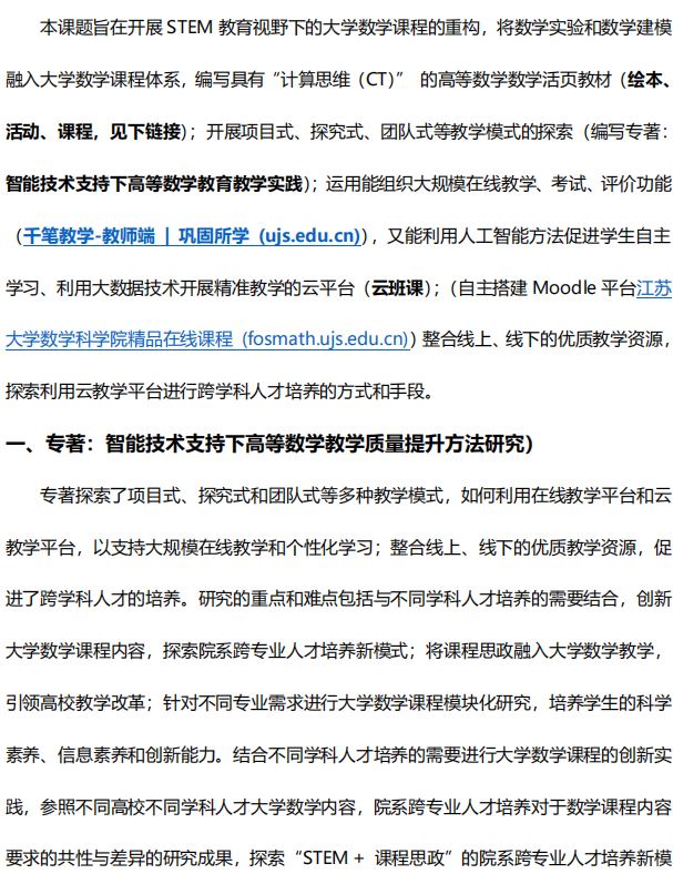 江苏大学陈文霞、代国兴 主持完成了2021年江苏省高?!按笱投逃薄盎】慰纬倘骸弊ㄏ羁翁狻癝TEM理念下大学数学课程的跨学科人才培养研究”(课题编号:2021JDKT046),课题组主要成员:徐传海、卢殿臣、傅 敏、范兴华、赵桃艳、王林君、张剑梅、房厚庆。