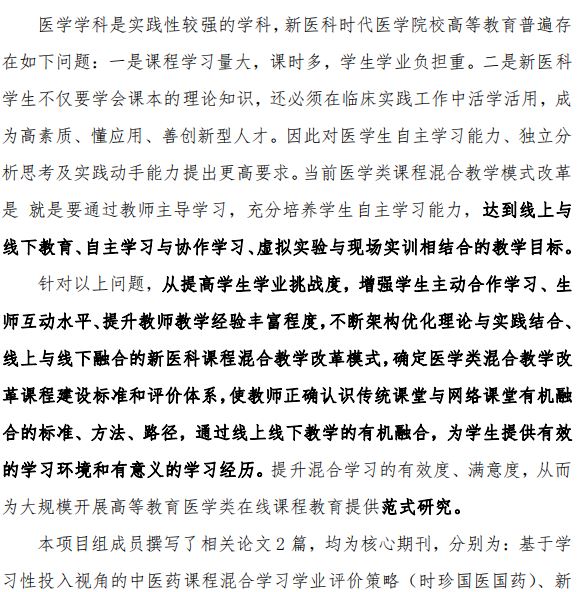 江苏省高校教学研究工作委员会(南京中医药大学)陈明 主持完成了2021年江苏高?!敖萄а芯抗ぷ鳌弊ㄏ羁翁?/span>(课题编号:2021JSJY011),课题组主要成员:徐桂华、牛浩、仇云龙、戴建国、谷巍、贾静、李莉
